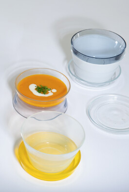 The modular tableware combines aspects of serving and storing food. The concept is an examination of the current problematic food culture and its resulting food waste, which takes place predominantly in private households.